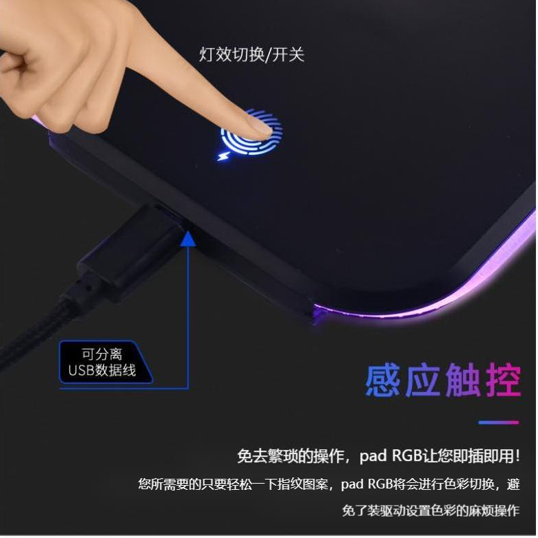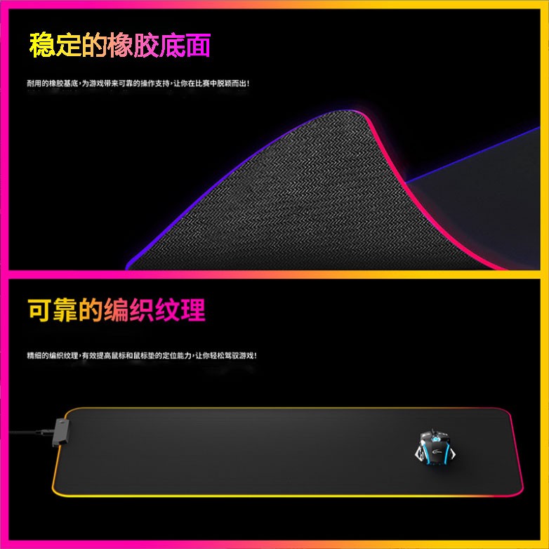 炫彩RGB游戲鼠標(biāo)墊,織物面料編織,表面細(xì)膩、平整、操作穩(wěn)定,帶燈光切換按鍵,輕輕一按,燈光可自由切換,加厚橡膠底部,穩(wěn)固防滑